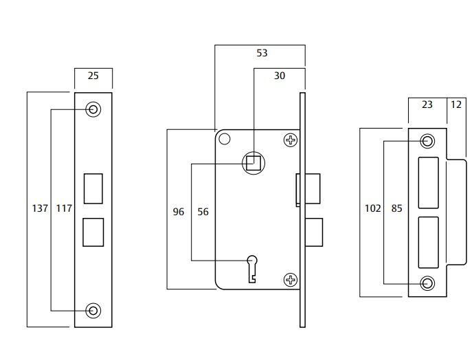Perfect for use on timber doors with glass where there is little room to fit a lock. Lock case has a depth of 53mm from edge of door